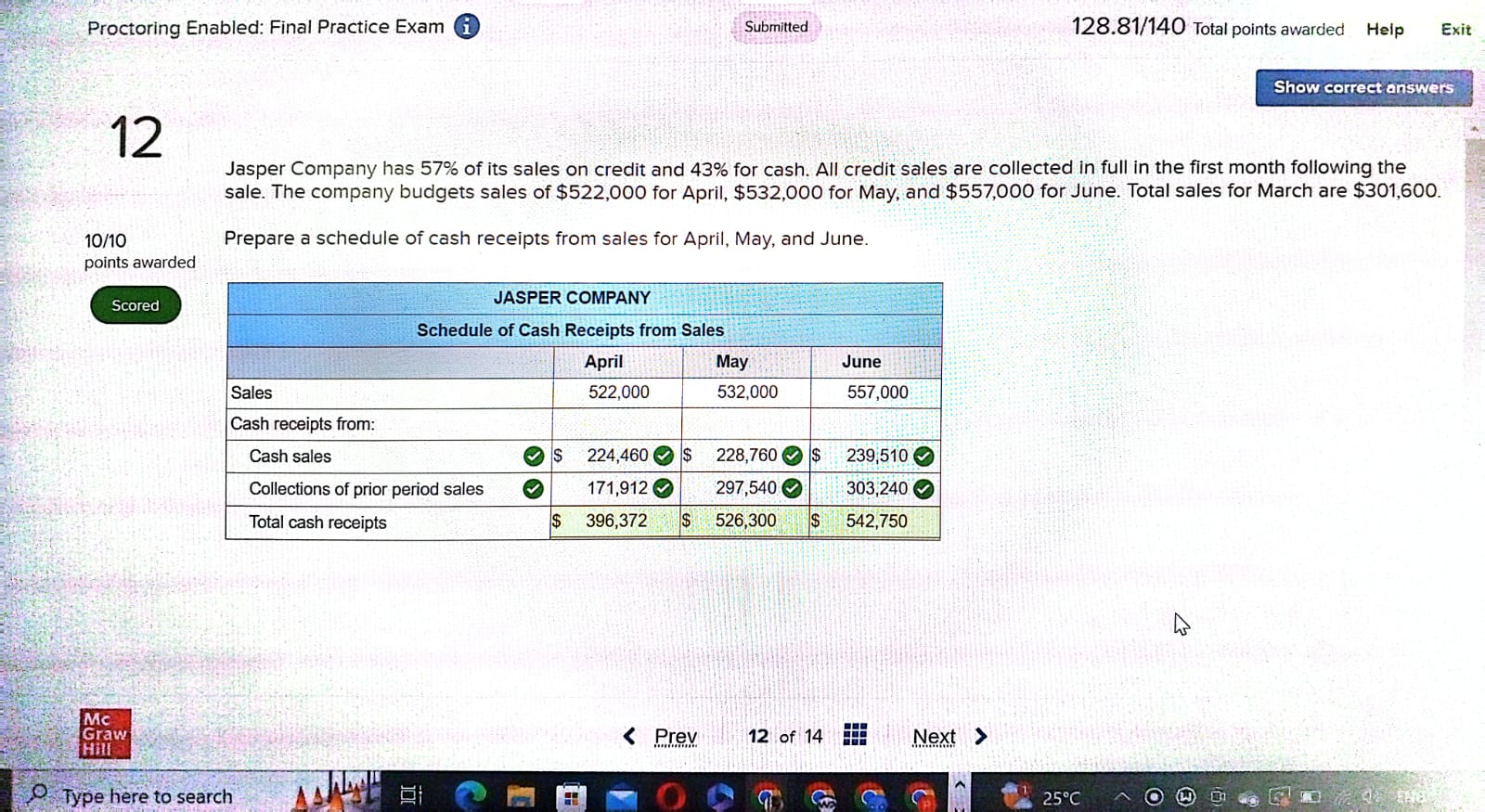 Jasper Company has 57% of its sales on credit and 43% for cash. All credit sales are collected in full in the first month following the sale. The company budgets sales of $522,000 for April, $532,000 for May, and $557,000 for June. Total sales for March are $301,600.